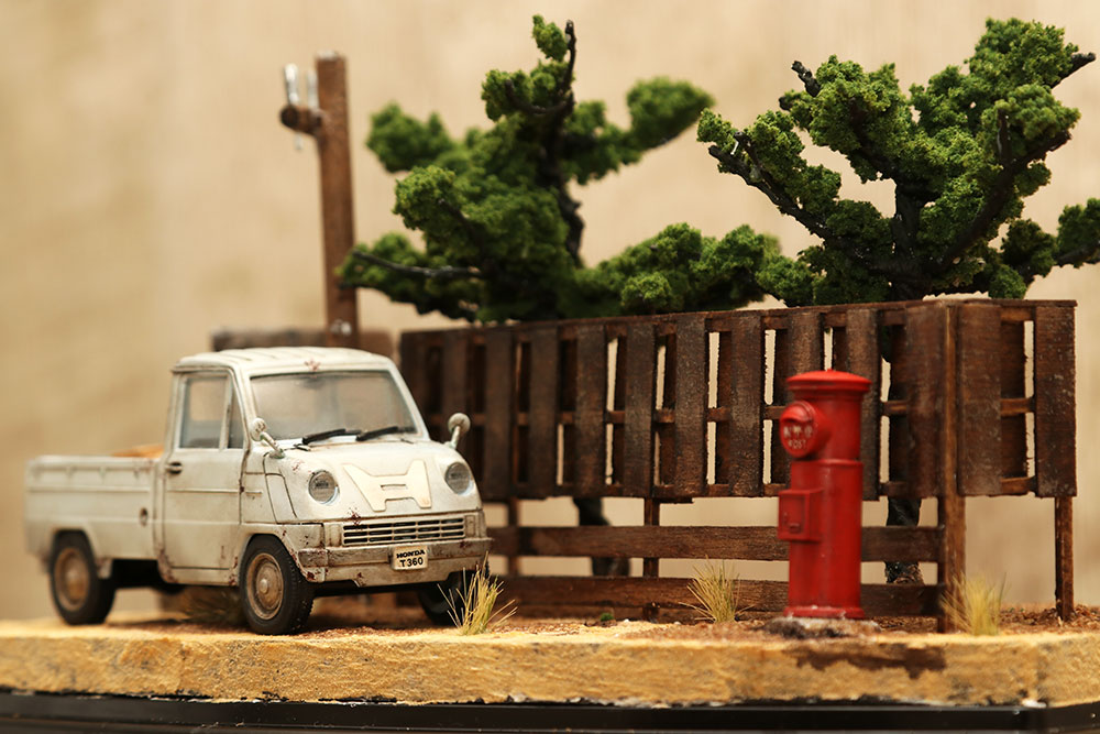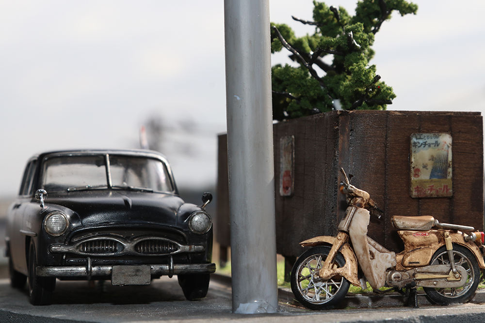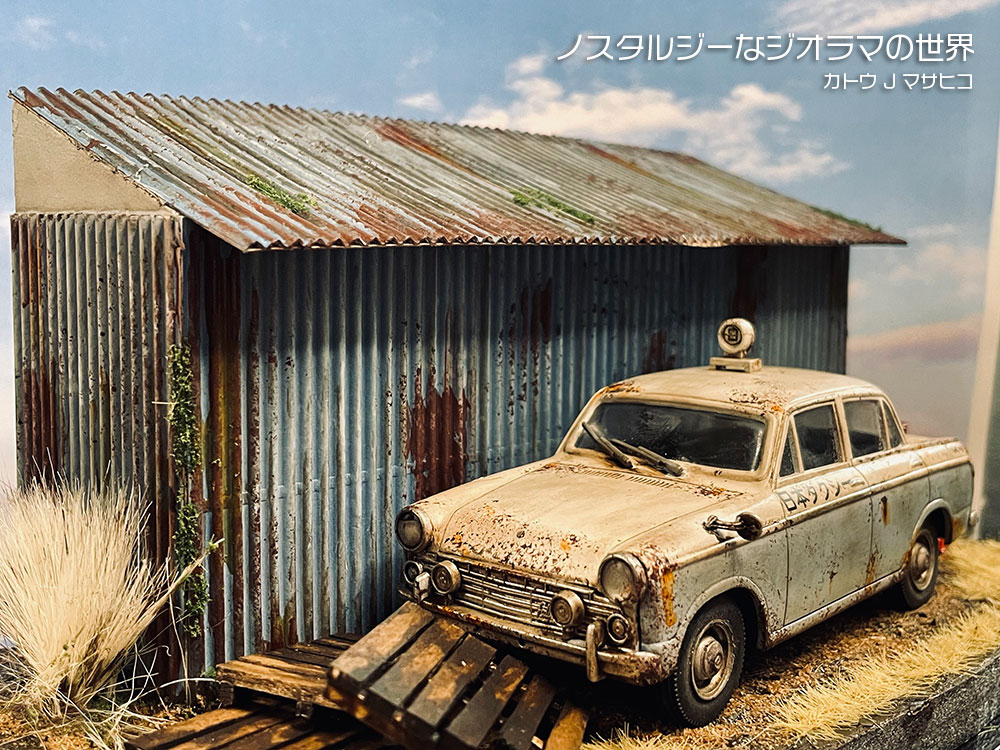 その他、過去の作品では、「ノスタルジーなジオラマの世界」というシリーズで、車のプラモデルをメインに利用して改造したり、ウェザリングなどを施し、背景やその他の小物は色々な材料を駆使して手作りしていました。
